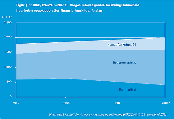 Fra 1994 til 2000 har det vært en ørliten vekst i Norges deltagelse i internasjonalt FoU-samarbeid, men dette skyldes at det offentlige, gjennom Norges Forskingsråd og departementene har økt sin deltagelse. Næringslivets deltagelse har gått relativt kraftig tilbake, fra 620 mill. kr. i 1996 til 401 mill. kr. i 2000. Det er altså en tendens i retning av at norsk næringsliv er mindre innstilt på internasjonalt forskningssamarbeid nå enn for noen år siden.