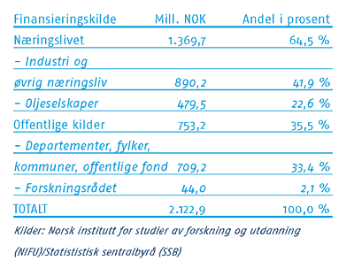 Næringslivet svarer for nærmere to tredjedeler av Norges finansiering av FoU-aktivitet i utlandet. Det er særlig oljeselskapene som kjøper FoU-tjenester i andre land enn Norge. Det offentlige bidraget består i hovedsak i at departementene finansierer FoU- aktiviteter i utlandet.